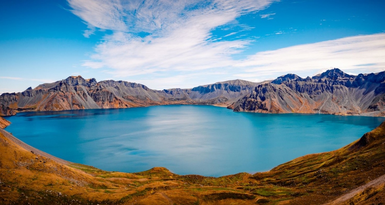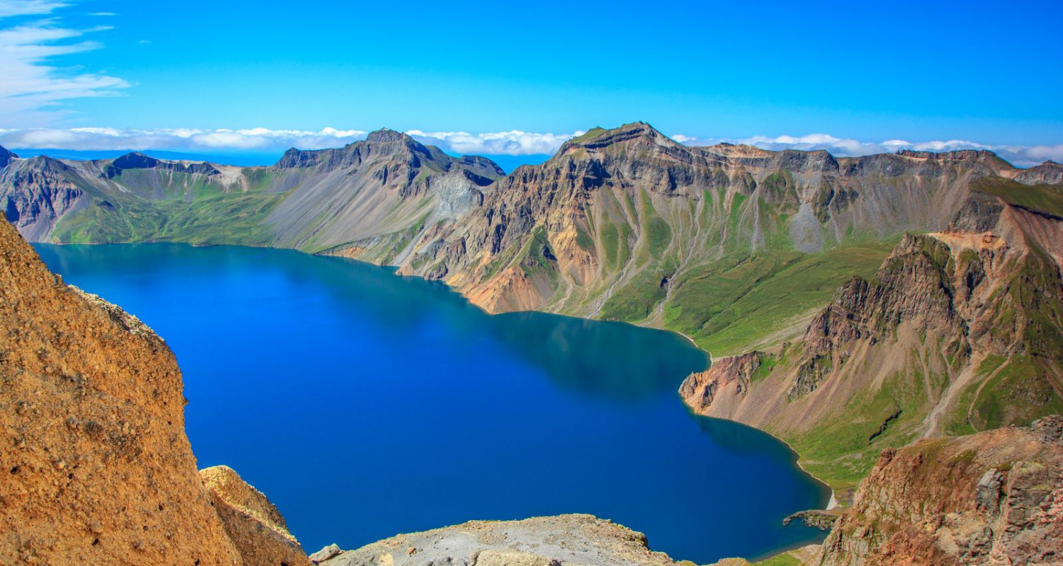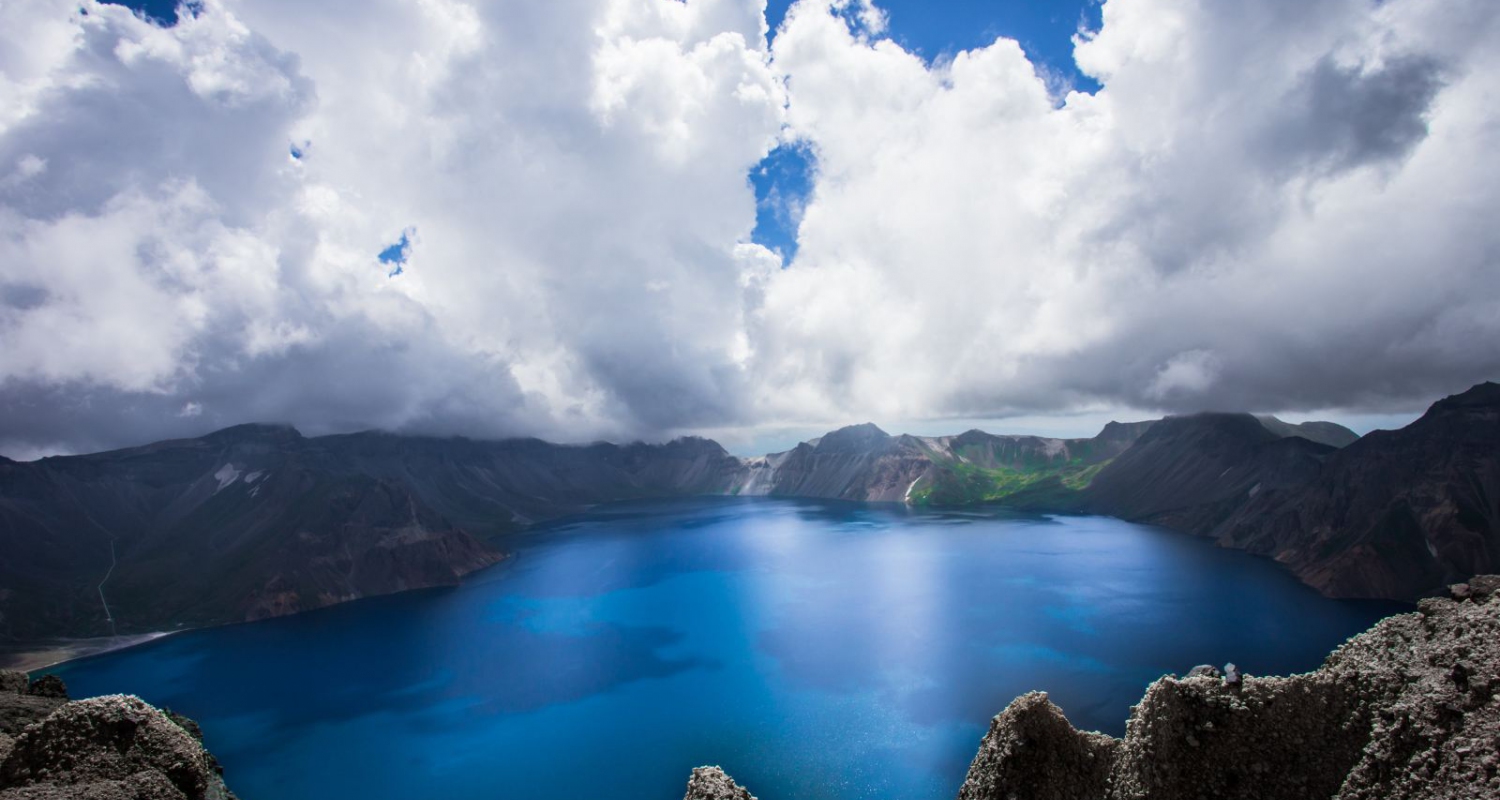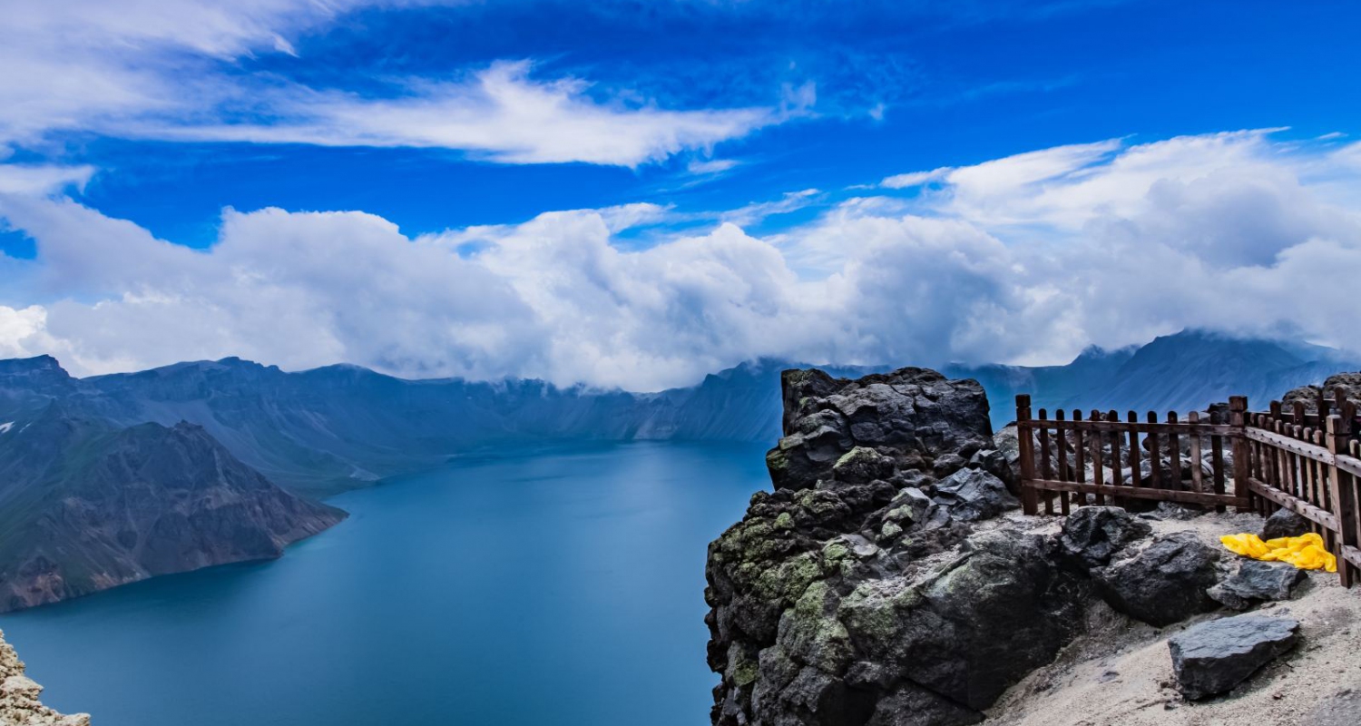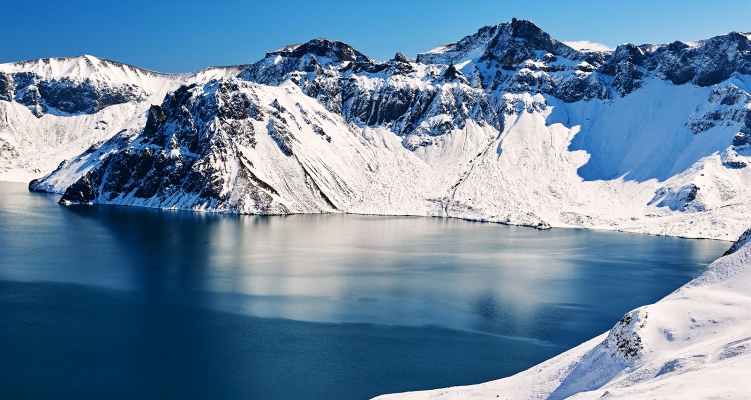 长白山天池是火山喷发后在雨水、雪水和地下泉水的作用下形成的火山口湖,它也是松花江的源头。游客登上山顶可见群峰叠嶂、气势恢宏,十六座山峰簇拥着一潭平静的湖水,在蓝天晴空的映照下,湖水深邃幽蓝,格外迷人。